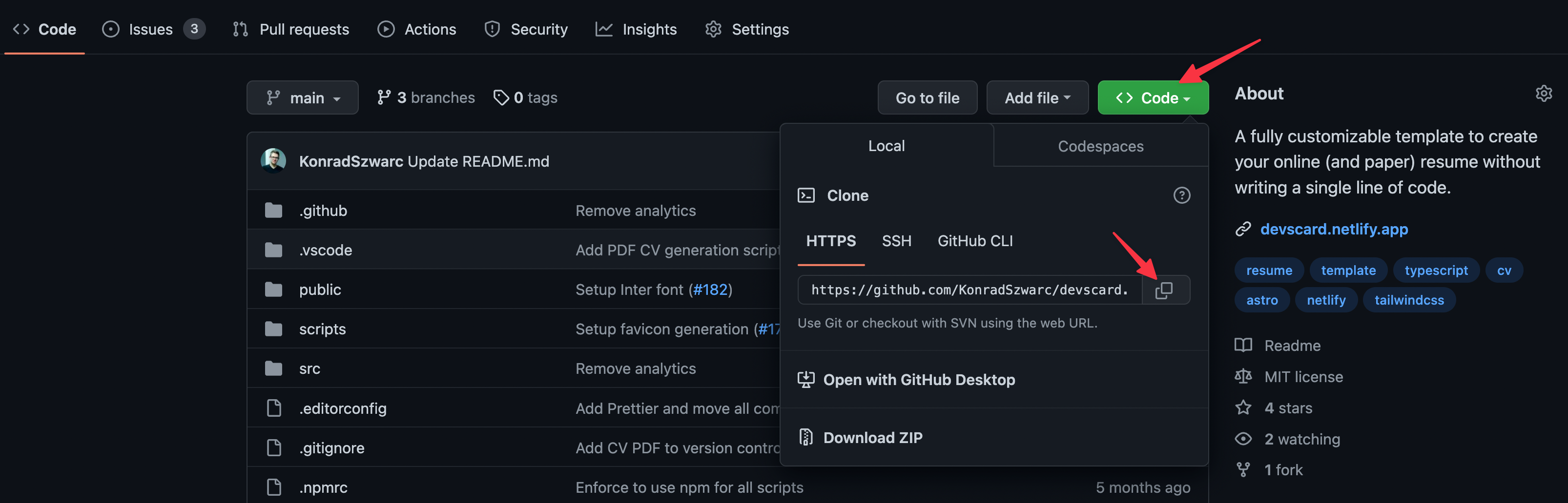 src/content— contains Markdown files for each section of the resume (Experience, Education, Portfolio, etc.). Edit these files to update your content.src/dataconfig.ts— use it to provide metadata of your website and set up its locales.helpers— helper functions you can utilize to reduce the amount of repetitiveness when setting up your socials and skills.links.ts— functions that ensure you always use the same icon and name when providing links to external websites.skills.ts— one place where you define your skills to reuse them in multiple sections.